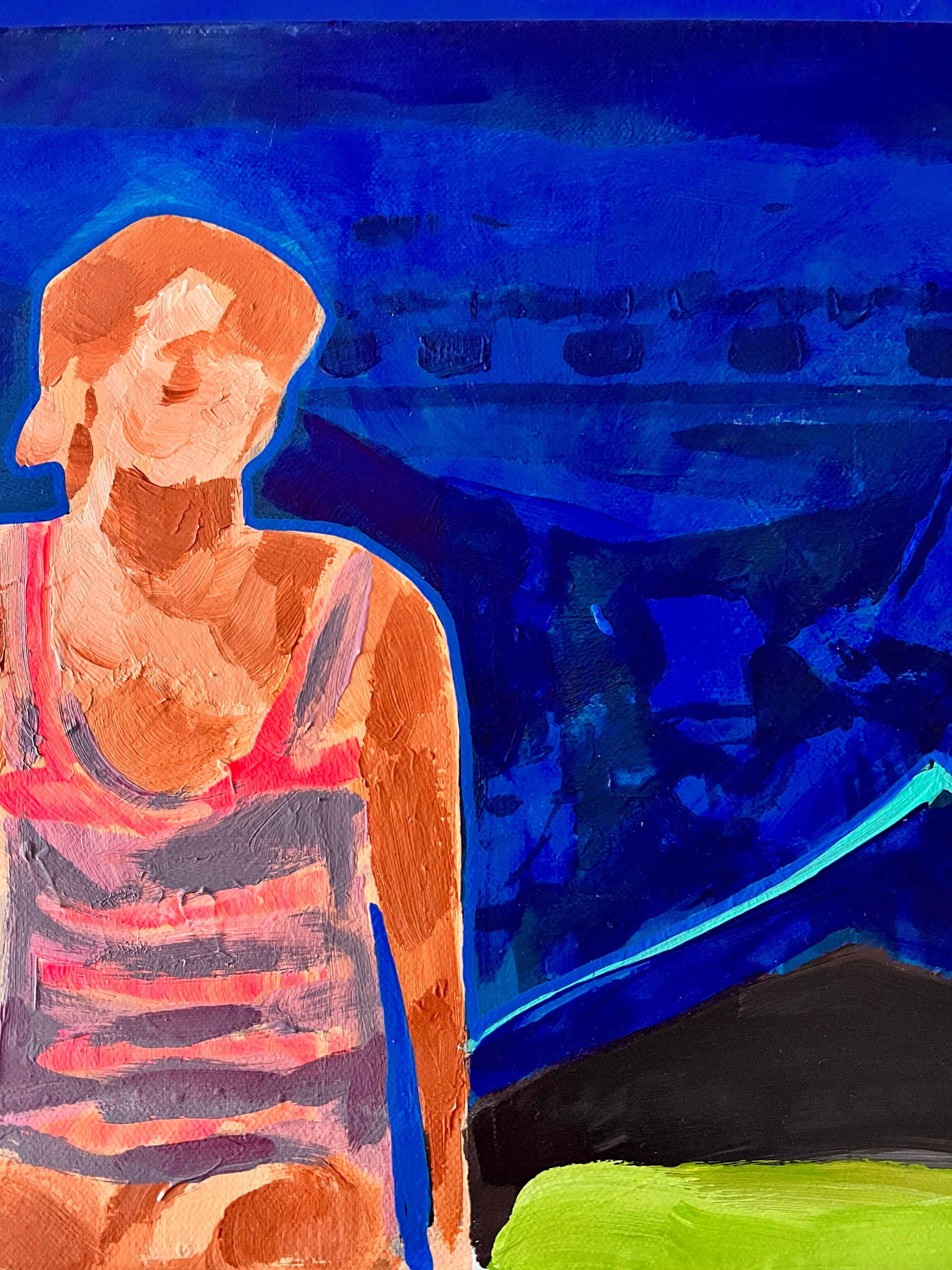 The facelessness is deliberate. These figures aren’t portraits of specific people, they’re vessels for memory, emotion, and presence. By removing facial features, I create a space where the viewer can step in and inhabit the scene. There’s something quietly subversive in that refusal to define, it makes the body carry the story through posture and placement rather than through personal details.